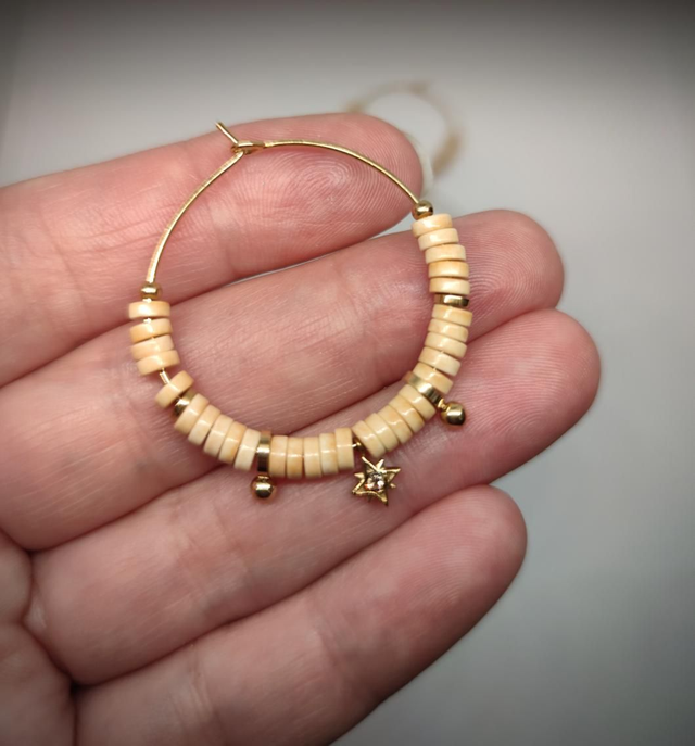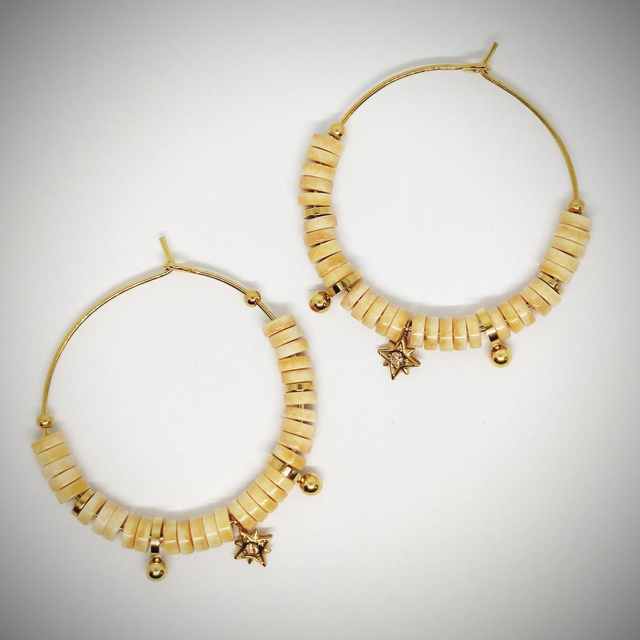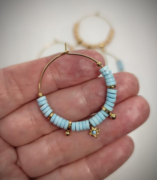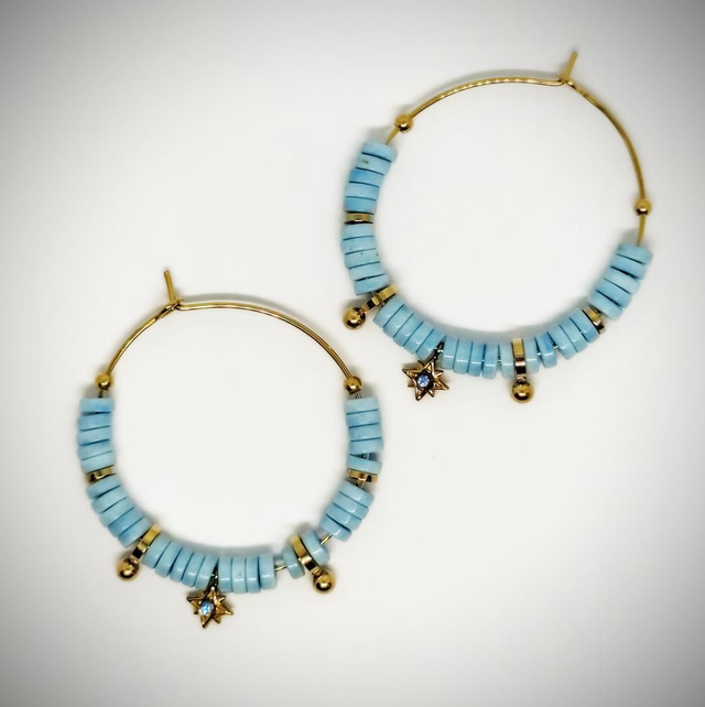 composé de perles en acier et de pierres naturelles Boucles d'oreilles type créoles ornées de perles en acier et de pierres naturelles.